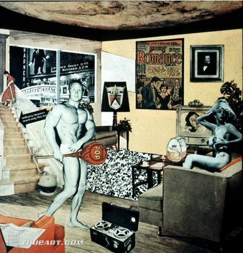 英國(guó)人理查德·漢密爾頓,用拼貼的方式創(chuàng)作的這幅作品宣告了波普藝術(shù)的誕生。藝術(shù)家調(diào)動(dòng)、整合了兩種后來(lái)為波普藝術(shù)家們所愛用不已的資源:現(xiàn)代科技和大眾傳媒文化。