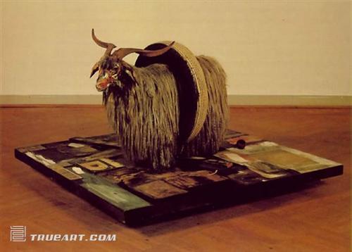 羅伯特·勞森伯格,是美國(guó)波普藝術(shù)家的代表人物。他的作品《交織字母》是一只腰上套著一個(gè)汽車輪胎的山羊的人工制品,這里的羊,輪胎有特殊含義,是同性戀的標(biāo)志,反映當(dāng)時(shí)同性戀爭(zhēng)取自身權(quán)益的情況,具有很強(qiáng)的現(xiàn)實(shí)性。