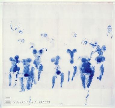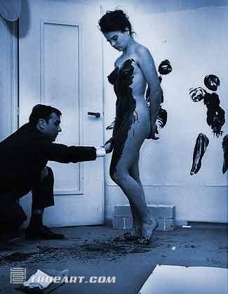 伊夫·克萊因,他用合成樹脂混合藍(lán)色色料而得到的高貴而靜穆的“克萊因藍(lán)”,出現(xiàn)在他的大多數(shù)作品、繪畫和雕塑中,如《藍(lán)色單色畫》、《人體測(cè)量術(shù)》,以拖拉涂抹了藍(lán)色顏料的裸女在鋪在地面的畫布上得到痕跡為作品。