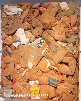 法國(guó)雕塑家凱撒,采用擠壓的方式來(lái)表達(dá)對(duì)消費(fèi)的關(guān)注。將瓦楞紙壓縮在畫框里垂直懸掛形成平面展示。