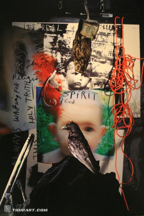 吉姆·戴恩的《精神第二版》畫面標(biāo)志為鳥,是現(xiàn)成品與繪畫結(jié)合在一起的裝置雕塑。