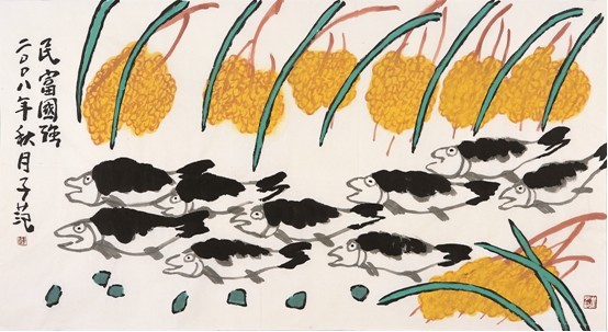 其實(shí),崔老的畫既脫胎于中國(guó)文人畫,卻又沒(méi)有文人畫的陳腐氣,其筆端流出的稚拙、幽默、夸張,無(wú)不反映出他對(duì)新生活和大自然的熱烈追求和深情厚愛。他把篆隸和行草融進(jìn)繪畫創(chuàng)作,用筆抑揚(yáng)頓挫、蒼勁有力,用墨濃淡宏量、氣勢(shì)非凡,用色冷暖相宜、濃淡兼施,這恰恰于畫中注入了時(shí)代氣息和新的藝術(shù)活力。