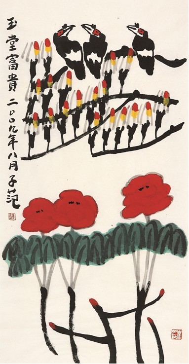崔老秉此真理,將中國(guó)大寫意畫的時(shí)代特色與質(zhì)樸民俗相融合,比古往今來(lái)的大寫意更強(qiáng)烈、更簡(jiǎn)潔、更質(zhì)樸、更濃重。他將寫意花鳥的寫意精神和寫意手法推向了極致,追求極簡(jiǎn)、極粗獷、極潑辣、極實(shí)在、極濃重。飽滿的感情、豐厚的內(nèi)容、強(qiáng)烈的形式,以及淳樸的民風(fēng),他畫得大象無(wú)形,畫得活力四射。