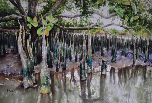 藝術(shù)創(chuàng)作源于生活,藝術(shù)家在生活中的任何遭遇,都可能成為他藝術(shù)創(chuàng)作的靈感來源。每一位藝術(shù)家的藝術(shù)表現(xiàn)都無一例外的受到他所在的環(huán)境所影響和制約。啟江常年生活在海南島,因此他的水彩風景畫也就是從海南的自然景觀中得到感悟,必然要表達的也是海南的大自然;海南島是一個熱帶海洋氣候的大島,在這里最美的是熱帶雨林,最多的也是熱帶雨林,熱帶雨林中最突出的色調(diào)就是濃濃的綠色。因此,綠色也就成為他無法繞過的一道問題。對于綠色的特點他心里十分清楚,但是,明知艱難還要為之,就他的這份勇氣,我也要敬佩三分。黃啟江的創(chuàng)作道路,一直都在奉行著現(xiàn)實主義,在各種流派、各種主義橫行畫壇的日子里,他從來都沒有動搖國自己的信念。他最早給我看的作品是表現(xiàn)海南的紅樹林,后來給我看到的還是不同角度表現(xiàn)的紅樹林。在色彩運用上,他大膽的運用了很多非常飽和的綠色,可見他對紅樹林已經(jīng)十分癡迷,究竟是是什么原因讓他對紅樹林如此的癡迷和執(zhí)著,投入那么多時間來研究。我想,這也許跟它的身世是分不開的,紅樹林是生長在海邊的喬木雖然常年生活在水中,但是紅樹林卻是最缺水的植物。在大海的眼里,紅樹林是陸地植物,但是在大山坡面前,它的故鄉(xiāng)又屬于大海。紅樹林生長周期非常長,由于需要抵抗?jié)q潮時候海浪的沖擊,它的樹頭上長著很多根系,將自己牢牢地固定在灘涂上面。也許是身份太過于相似,黃啟江對紅樹林一直都保持著非常飽滿的熱情。