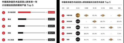 根據(jù)胡潤(rùn)百富發(fā)布的《高凈值人群藝術(shù)品投資報(bào)告》中顯示,高凈值人群在規(guī)劃未來一年的投資理財(cái)產(chǎn)品時(shí),有41.3% 的人群將投資藝術(shù)品作為首選;其對(duì)藝術(shù)品投資占家庭總投資額的比例平均達(dá)到 22.2%。
