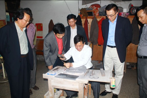 為創(chuàng)作這套“華夏名剎硯”組織了一個精英創(chuàng)作團隊,他們是:中國著名山水畫家韓光森,亞太地區(qū)手工藝大師、中國工藝美術(shù)大師黎鏗擔(dān)任監(jiān)制,非物質(zhì)文化代表性(端硯技藝)傳承人楊焯忠擔(dān)任設(shè)計師,雕制工作由肇慶市“華龍軒”、“聚硯齋”兩家端硯廠共同承接完成?!伴_工儀式”之前,該硯創(chuàng)作團隊向肇慶市委常委、宣傳部長梁志強做了創(chuàng)作匯報,聽取了梁常委的指導(dǎo)意見。