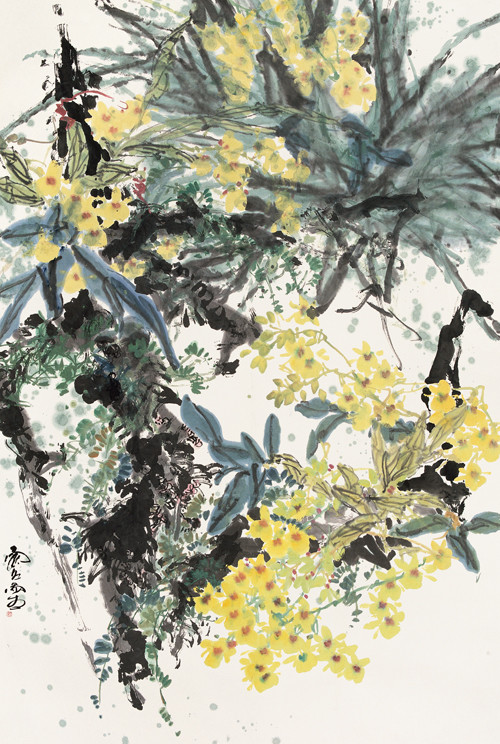 姚舜熙的花鳥(niǎo)畫(huà)具有一種反映出當(dāng)代藝術(shù)特質(zhì)的“大花鳥(niǎo)境界”。這種境界的核心是“大”。在藝術(shù)意境上具有當(dāng)代藝術(shù)闊大、明朗、豐富與豪邁的品質(zhì)。他作品中的花鳥(niǎo)形象通常是充滿畫(huà)幅的,甚至有漲溢出畫(huà)幅有限空間的感覺(jué),由此使得畫(huà)面的視野遙遙向無(wú)限擴(kuò)展,他所畫(huà)的花卉草木飽滿密織,墨色交輝,閃動(dòng)著精神的光彩;他最大的特點(diǎn)是將花鳥(niǎo)畫(huà)的造型與廣袤寬闊的山川、大地、天空和空氣疊印在一起,使花鳥(niǎo)真正作為大自然的有機(jī)形體,還原于大自然的懷抱之中。于此可以說(shuō),姚舜熙在面對(duì)花鳥(niǎo)畫(huà)形象之時(shí),投注了對(duì)于自然生命深切的關(guān)愛(ài),他描繪的不僅是花鳥(niǎo)的儀態(tài),而是自然造物的生命本質(zhì),他的畫(huà)始終洋溢著一股郁郁蔥蔥,生生不息的生命氣象。
