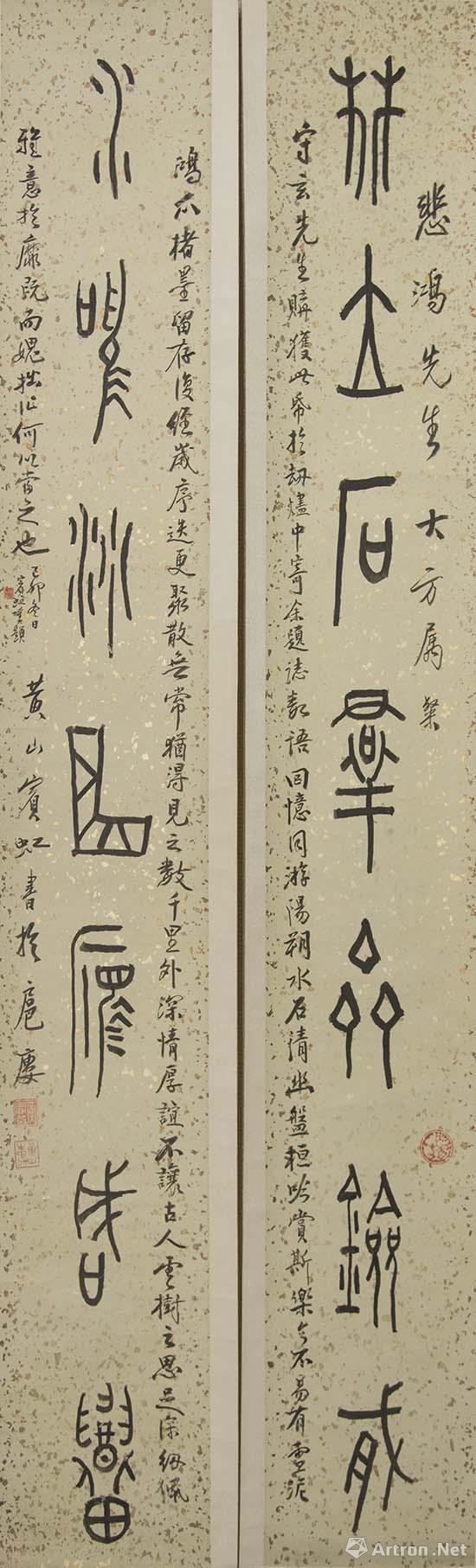 說(shuō)明 :吳昌碩(1844-1927),浙江安吉人,初名俊,又名俊卿,字昌碩等。他集“詩(shī)、書(shū)、畫(huà)、印”于一身,融金石書(shū)畫(huà)為一爐,被譽(yù)為“石鼓篆書(shū)第一人”、“文人畫(huà)最后的高峰”。此聯(lián)集自《石鼓文》,贈(zèng)沈石友先生。