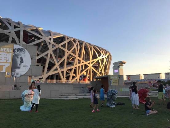 在9月的一個周末,記者在鳥巢北側富有現代解構美學線條的庭院外側,看到三三兩兩的觀眾正在巨大的大衛(wèi)頭像廣告下拍照刷屏。