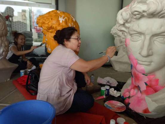 在鳥巢米開朗基羅國際藝術展展覽外圍,十幾個大衛(wèi)石膏頭像正在接受參展觀眾的再創(chuàng)造。有為大衛(wèi)頭涂上鳥巢紅的學生,有陪著孫女為大衛(wèi)頭貼滿水鉆的奶奶,有用鮮艷和絢麗水彩占領每個角落的小孩子,有用精致色彩工筆畫演繹東方花卉的藝術家……在現場自由活潑的氛圍里,不少好奇的觀眾紛紛加入了大衛(wèi)的藝術再造中。