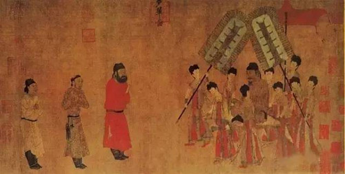 《步輦圖》,北京故宮博物院館藏珍品。絹本,設(shè)色,縱38.5厘米,橫129.6厘米,相傳為唐代著名畫家閻立本所繪,是以貞觀十五年吐蕃首領(lǐng)松贊干布與文成公主聯(lián)姻的歷史事件為題材,描繪唐太宗接見來迎娶文成公主的吐蕃使臣祿東贊的情景。線條流利純熟,富有表現(xiàn)力,由于此圖經(jīng)歷千余年的傳承,如今所能見到的閻立本作品,尚無一幀能毫無爭議地確定它為閻立本所做。