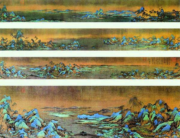 《千里江山圖》,北京故宮博物院館藏珍品。絹本,設(shè)色,縱51.5厘米,橫1191.5厘米,為中國北宋青綠山水畫作品。作者是北宋畫家王希孟,他18歲即為北宋畫院學(xué)生,后召入禁中文書庫,曾得到宋徽宗趙佶的親自傳授,半年后即創(chuàng)作了《千里江山圖》,可惜英年早逝,這幅畫也成為了王希孟唯一的存世作品。