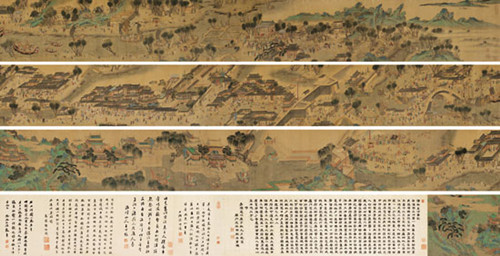 《清明上河圖》是北宋畫家張擇端僅見的存世精品,屬國寶級文物,現(xiàn)藏于北京故宮博物院?!肚迕魃虾訄D》寬25.2厘米,長525厘米,絹本設(shè)色。作品以長卷形式,采用散點(diǎn)透視構(gòu)圖法,生動記錄了中國十二世紀(jì)北宋汴京的城市面貌和當(dāng)時漢族社會各階層人民的生活狀況。描繪當(dāng)時清明時節(jié)的繁榮景象,是汴京當(dāng)年繁榮的見證,也是北宋城市經(jīng)濟(jì)情況的寫照。