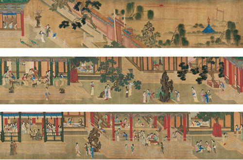 《漢宮春曉圖》,中國重彩仕女第一長卷,為明代仇英所作。絹本重彩,尺幅很大,37.2cm×2038.5cm,裝飾性繪畫巨制。漢宮春曉是中國人物畫的傳統(tǒng)題材,本幅以春日晨曦中的漢人宮廷為題,描繪後宮佳麗百態(tài);全畫構(gòu)景繁復(fù),用筆清勁而賦色妍雅,鋪陳出宛如仙境般的瑰麗景象。誠為仇英歷史故事畫中的精彩之作?,F(xiàn)藏在臺北故宮博物院。