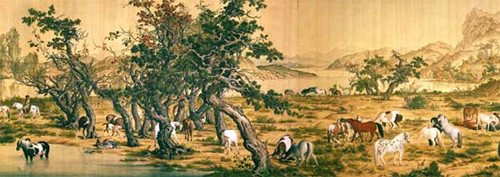 《百駿圖》,該稿本為紙質(zhì),縱102厘米、橫813厘米。目前保留在臺北故宮博物院。意大利人郎世寧在1715年以傳教士的身份遠(yuǎn)涉重洋來到中國,就被重視西洋技藝的康熙皇帝召入宮中,從此開始了長達(dá)五十多年的宮廷畫家生涯。在繪畫創(chuàng)作中,郎世寧融中西技法于一體,形成精細(xì)逼真的效果,創(chuàng)造出了新的畫風(fēng),因而深受康熙、雍正、乾隆器重?!栋衮E圖》是他的代表作之一。