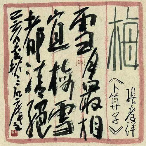再觀作品《梅蘭竹菊》,在米色雅致的紙箋上,宋代張孝祥《卜算子》里的雪梅,明代張羽《詠蘭花》中的香蘭,唐代杜甫《詠竹》里的風雨竹,東晉陶淵明《酒飲》中的秋菊,四者沖破歷史時空的束縛,被整合于方寸之中,或濃或淡、忽粗忽細的墨色與線條褶褶生輝,象征著文人風骨的梅蘭竹菊在向觀者敘述無限詩意;