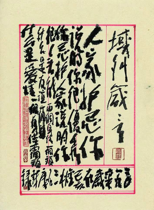 在禪黃色的紙張上,用微醺的醉墨書寫著調(diào)侃的自編詩句“殘山剩水出刁民,家學淵源出傻子”,微妙的濃淡層次感中灌注著人生哲理,這是經(jīng)歷風雨打磨后的感悟所得。
