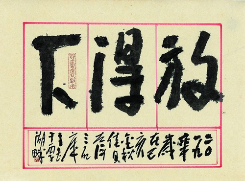 在規(guī)整的長方形內(nèi),《放得下》三字顯得斑駁老辣,宛如三位得道高僧佇立于殿堂之上點化蕓蕓眾生,印章“誤入畫壇悲歡來”穿梭其中,悲亦喜來喜亦悲,放下的過程也是得到的過程,透著辯證的智慧抉擇;