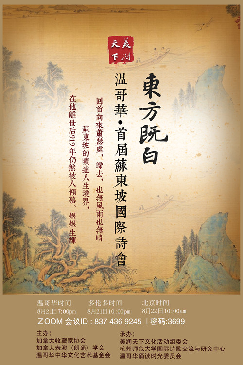 講座在大中華圈反響不同尋常,我們順勢(shì)策劃東方既白--溫哥華·首屆蘇東坡國際詩會(huì),為紀(jì)念蘇東坡逝世919周年定于8月21日線上舉行。韓長福君正在緊鑼密鼓地籌備著。期待蘇軾更多的詩書畫和文化元素在詩會(huì)呈現(xiàn)。