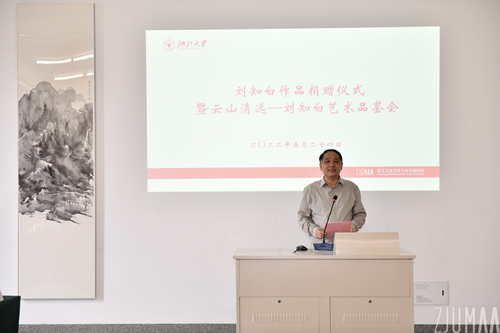 孤峰頂上,道法自然,云山清遠(yuǎn)。劉知白的藝術(shù)成就成為專家學(xué)者們思辯的關(guān)注熱點。適逢浙江大學(xué)125周年校慶之際,5月24日上午在浙江大學(xué)藝術(shù)與考古博物館舉辦了劉知白作品捐贈儀式,浙江大學(xué)黨委副書記葉民和第十屆杭州市政協(xié)主席葉明出席活動并致辭。浙江大學(xué)圖書館館長樓含松和浙大藝術(shù)與考古博物館館長劉斌發(fā)表了熱情洋溢的講話。建設(shè)銀行總行原副行長余靜波,浙江大學(xué)發(fā)展委員會副主席李培培,中國囯家畫院院委、中國美院原副院長劉健,浙大藝術(shù)與考古學(xué)院黨委書記方志偉,浙大藝術(shù)與考古博物館常務(wù)副館長馬景娣,浙大藝術(shù)與考古學(xué)院教授、美術(shù)系主任池長慶,劉知白學(xué)生、杭州師范大學(xué)美術(shù)學(xué)院教授孔耘,劉知白先生弟子、貴州省美協(xié)理論委員會原副主任安朝剛,浙大藝術(shù)與考古學(xué)院美術(shù)系副主任、副教授吳強等和收藏家應(yīng)忠良、胡德林、胡關(guān)妙等嘉賓與會。捐贈者劉維陽是劉知白先生第十一子,因工作原因,委托周岳平先生宣讀了充滿情懷的發(fā)言。捐贈儀式由浙江大學(xué)發(fā)展聯(lián)絡(luò)辦副主任、浙大教育基金會副秘書長丁海忠主持。