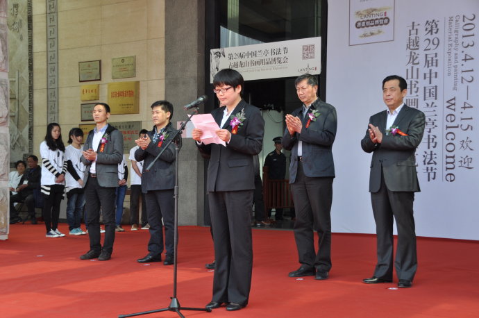 開幕式上,李宴清、滕貞甫、丁立清、陳旭明、陳伯懷、柏宏、樂美勤、程明、宋亞娜等重要嘉賓出席了開幕式并發(fā)表講話,大家對紹興書畫社連續(xù)三年成功舉辦書畫用品博覽會表示支持和祝賀,并希望紹興書畫社以后能繼續(xù)舉辦更大規(guī)模的書畫用品博覽會,成為中國蘭亭書法節(jié)上的一個亮點活動,能為廣大書畫愛好者和文房用品廠商搭建一個交流和購買的最佳平臺。