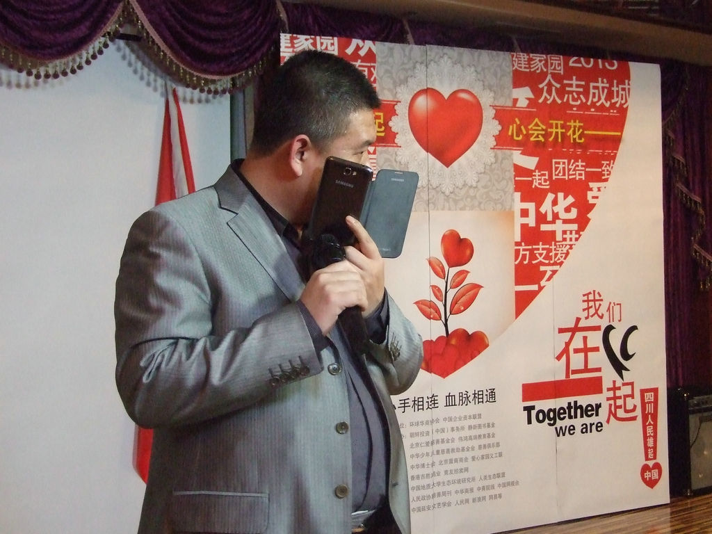 孟泓安秘書長正與身在雅安地震現(xiàn)場的仁愛慈善基金會(huì)的負(fù)責(zé)人連線,在連線中確定所要的物品!