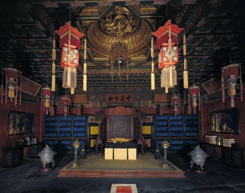 后殿靠墻部分按道光時的陳設(shè)恢復(fù):“中室列龕三,奉太祖、太宗、世祖;左一室龕二,奉圣祖、高宗;右一室龕二,奉世宗、仁宗。昭穆仍舊制,余四室分列八龕焉?!睌M恢復(fù)5間11室原狀陳設(shè)。