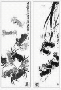 比如,以假充真,假貨標(biāo)真品價(jià)格。齊白石的工筆草蟲畫向來(lái)身價(jià)不菲,一只“草蟲”以數(shù)萬(wàn)元計(jì),于是乎有的所謂的齊白石作品竟然出現(xiàn)了七八只草蟲漫天飛、滿地爬的乖張情形。齊白石生前潤(rùn)單上向有“橫幅不畫”的聲明,近年來(lái)拍賣市場(chǎng)上卻冒出了大量齊白石的橫幅畫。至于拍賣市場(chǎng)上時(shí)常可以見(jiàn)到的名畫家作品的“雙胞胎”乃至“多胞胎”現(xiàn)象,其中更是有詐。