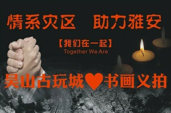 2013年4月20日上午8時(shí)02分在四川省雅安市蘆山縣(北緯30.3度,東經(jīng)103.0度)發(fā)生7.0級(jí)地震,震源深度13公里,造成了極大的傷亡和損失。為了盡快傳遞一份愛心,盡最大努力支援災(zāi)區(qū)的同胞,杭州慈善總會(huì)、杭州吳山古玩城與華夏收藏網(wǎng)聯(lián)合省市公眾媒體和知名書畫藝人和社會(huì)各界愛心人士,將為雅安地震災(zāi)區(qū)組織專場(chǎng)愛心書畫網(wǎng)拍義賣活動(dòng)。