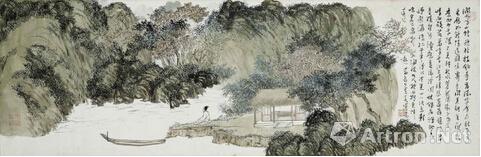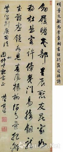 本次嘉德秋拍“會(huì)心——樂藝齋藏古代書畫”專場薈萃韋爾夫婦的精心收藏,其中《山中枕石圖》曾為“一貫軒”主人王伯元和王季遷鑒藏髡殘的重要傳世畫作,有《髡殘山水辨?zhèn)巍贰ⅰ肚濉諝埳剿?lt;山中枕石圖>真?zhèn)握劇返任恼玛P(guān)注,并曾多次出版著錄。文征明是明四家之一,更是吳門畫派的領(lǐng)軍人物?!秴巧綌垊佟穼懱吧律蠋X下,松高樹茂,精舍隱現(xiàn)于密林煙靄之中,湖邊長橋之上,有士人結(jié)伴為好友送行,一舟已載客漸漸遠(yuǎn)去。另外董其昌《行書五言詩》軸,縱172、橫58厘米。綾本,行草書四行。書為李蜃園書留別侯司徒詩。章法疏宕閑雅、飄逸流暢,極為難得。