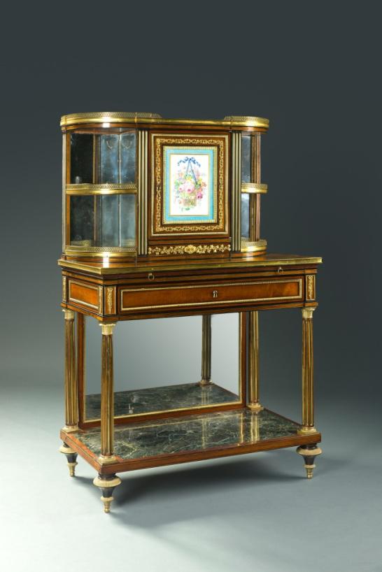 本次展品中有部分來自法國(guó)十九世紀(jì)末與二十世紀(jì)初最偉大的巴黎高級(jí)木匠弗朗索瓦?林克(Fran?ois Linke,,1855-1946) (以下簡(jiǎn)稱“林克”)。林克的作品因其超凡的品質(zhì)以及對(duì)路易十五融合新藝術(shù)主義風(fēng)格的富有創(chuàng)新性的獨(dú)特藝術(shù)風(fēng)格的演繹而備受贊譽(yù)。1906年他得到了法國(guó)最高榮譽(yù)十字勛章。 例如,展品中西班牙國(guó)王的寫字桌是19世紀(jì)法國(guó)罕見的弧形拉門寫字桌。這件弧形拉門淑女寫字桌是林克給西班牙國(guó)王制作的,路易十五風(fēng)格,細(xì)節(jié)精湛完美。林克制作櫥柜的精美技藝都包含在其中:精心打造的鎏金銅飾和薄板貼面工藝以及一系列櫥柜制作工藝。