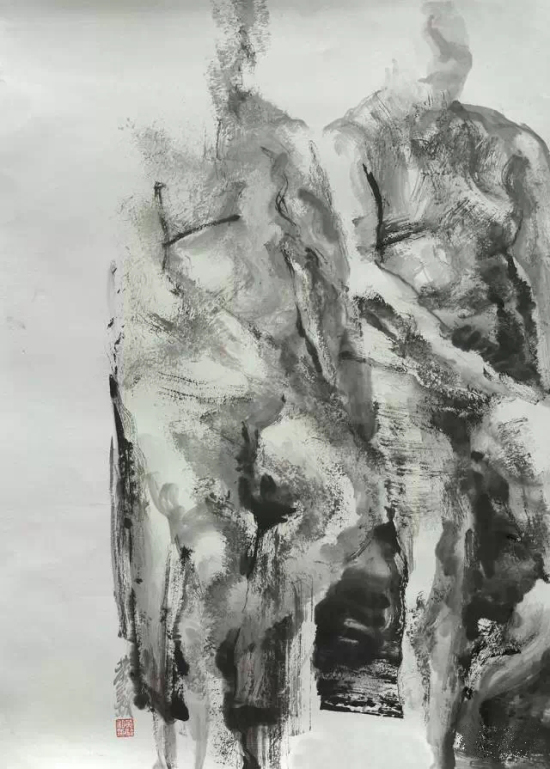 同中國傳統(tǒng)文人畫家一樣,黃駿在關注筆墨趣味和畫面形式感的同時,也極為注重哲學思想的表達。在他的畫里,人物與背景時常融為一體,而人物的形體又往往變形扭曲,呈現(xiàn)出山水畫中層巒疊嶂的視覺效果。中國繪畫本是中國哲學的直觀體現(xiàn),在黃駿筆下,傳統(tǒng)哲學思想當中的天人合一觀就在這水與墨的熔融當中卓然顯現(xiàn)。