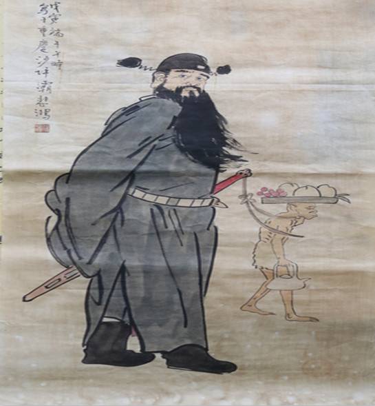 鐘馗在中國傳統(tǒng)文化中是捉鬼的神,其相貌丑陋,卻心地善良,嫉惡如仇,是非分明。人們常掛鐘馗畫以辟邪驅(qū)魔,歷代畫家也多有涉獵鐘馗形象。自鐘馗畫出現(xiàn)以來,鐘馗形象都是面貌丑陋、樣子古怪的,但是徐悲鴻先生筆下的鐘馗明顯以現(xiàn)實生活的人為原型,比例適度,神態(tài)飽滿,充滿了人情味。