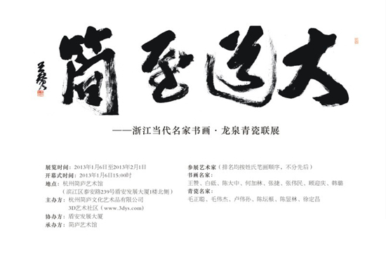 本次聯(lián)展特別邀請到王贊、白砥、陳大中、何加林、張捷、張偉民、顧迎慶、韓璐等當(dāng)代浙派書畫名家,以及毛正聰、毛偉杰、盧偉孫、陳壇根、陳顯林、徐定昌等龍泉青瓷名家(排名均按姓氏筆畫順序,不分先后)共襄盛舉,并將在3D藝術(shù)社區(qū)(www.3dys.com)網(wǎng)站上同步舉辦本次展覽的在線3D虛擬展,旨在以一場高品質(zhì)的藝術(shù)展覽迎接2013蛇年新春的到來,展示當(dāng)代浙派書畫名家、龍泉青瓷名家的風(fēng)采,感受中國精湛傳統(tǒng)藝術(shù)及工藝的魅力,傳承中華文明,弘揚(yáng)藝術(shù)文化,促進(jìn)浙江省及杭州市文化藝術(shù)的持續(xù)繁榮,為普羅大眾奉獻(xiàn)上一桌精美的饕餮盛宴,共享頂尖藝術(shù)帶來的震憾之美。展覽時間: 2013年1月6日至2013年2月1日