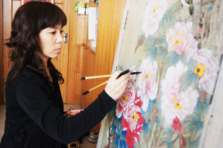 一個偶然的機會,在朋友的客廳里看到了一幅工筆牡丹畫,真是過目難忘。畫面中十幾朵牡丹競相怒放,花叢中點綴著幾只忙碌的小蜜蜂,似乎能聞其香,聽其音,有聲有色。記者不禁感慨,真是活色生香??!湊近畫面仔細(xì)查看落款,是一行娟秀的字體:楊俊艷。