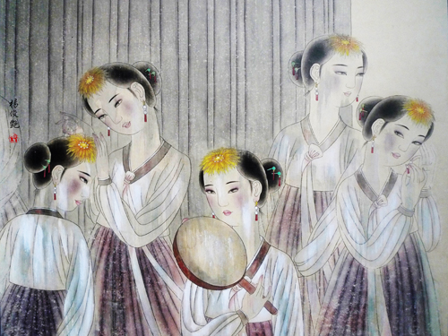 2007年暑期的一個傍晚,運城南風(fēng)廣場人頭攢動,熱鬧非凡。這里正在舉行匯報演出。觀眾們翹首駐足,津津有味的欣賞著精彩的節(jié)目。這時,一群身著表演服,天真爛漫的孩子走過來。孩子們一邊談笑,一邊互相整理著頭花服飾,還有的在比劃交流著表演動作。孩子們的穿著和舉動吸引了楊老師的注意力。楊老師立刻取出紙和筆,借助廣場燈全神貫注地開始捕捉孩子們各種姿態(tài)的速寫,一幅新作品開始在她腦海中醞釀和萌芽。源于自然,發(fā)于心靈的作品《鼓歌太平》問世了。